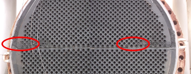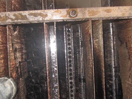 (1) gas phase cleaning for distillation unit in heavy oil and hydrogen sulfide (H2S), iron sulfide (FeS), light hydrocarbon cleaning, after cleaning device inside the device without oil, hydrogen sulfide and other toxic gases content is 0, the scene observation device of internal heat exchanger, tower partial residual sludge, most you can see the color of the metal wall device equipment. As shown in figure -3 to 6.